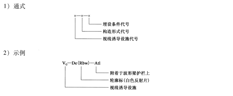 二、 波形护栏端部及过渡处理的设计代号由护栏端部及过渡处理构造形式代号和防护等级代号两部分组成。各种代号规定如下:
