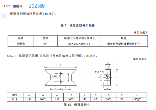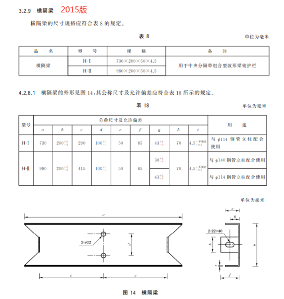 h) 更 改 了 横 隔 梁 的 用 途 、规 格 和 公 称 尺 寸 及 允 许 偏 差(见 4.3.7、5.2.7.1,2015 年 版 的 3.2.9、4.2.8.1);